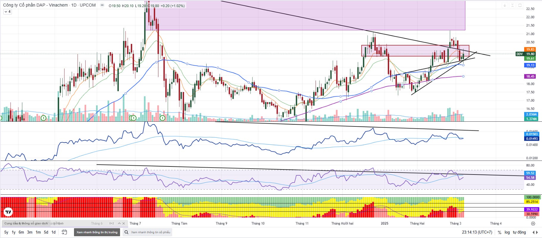 Xét về kỹ thuật Cổ phiếu DDV đang dao động quanh vùng 19,2 - 21 nằm trên MA50. Đây là dấu hiệu tích cực, nhưng cần vượt qua vùng 20.5-21 để xác nhận xu hướng tăng. Khối lượng giảm dần, phản ánh tâm lý chờ đợi tín hiệu rõ ràng hơn của nhà đầu tư.
