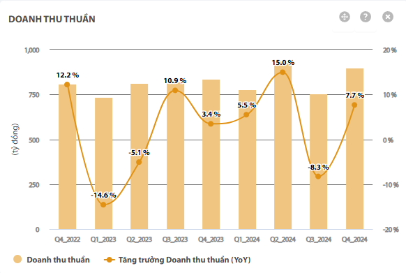 CTCP DAP - Vinachem (DDV) là doanh nghiệp sản xuất phân bón và hóa chất cơ bản, với kết quả kinh doanh quý 4/2024 khá ổn định. Doanh thu đạt 899 tỷ đồng, tăng 7,7% so với cùng kỳ năm trước, trong khi lợi nhuận sau thuế (LNST) đạt 59 tỷ đồng, giảm nhẹ 6%. Điểm đáng chú ý là tình hình tài chính lành mạnh với lượng tiền mặt lớn, lên tới 1.146 tỷ đồng và không có nợ vay.