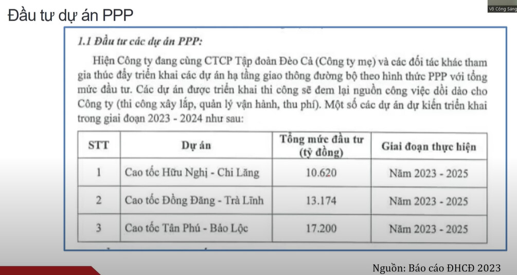 Doanh nghiệp sở hữu những dự án BOT bao gồm: Trạm thu phí Cù Mông, Trạm thu phí Đèo Cả, Trạm thu phí Bắc Hải Vân, Trạm thu Phí An Dân, Trạm thu phí An Lộc, Trạm thu phí Bắc Giang-Lạng Sơn, Trạm thu phí Km93+160 QL1 BGLS, Trạm thu phí Trung Lương - Mỹ Thuận