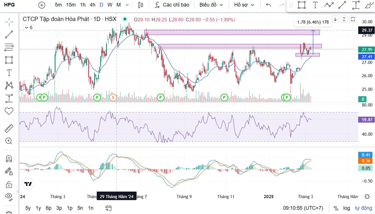 Giá đang trong xu hướng tăng với kháng cự tại 28,400 VND và hỗ trợ tại 27,500 VND