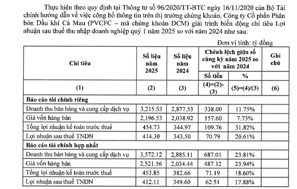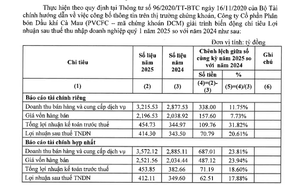 - Lợi nhuận sau thuế của DCM quý 1.2025 tăng 17.88% svck năm 2024 cụ thể tăng 62.51 tỷ đồng.