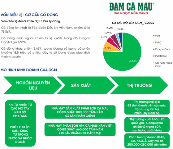 - CTCP Phân bón Dầu khí Cà Mau (DCM – HOSE) là doanh nghiệp hàng đầu trong sản xuất phân bón. Hiện nay sản phẩm chủ lực của DCM là phân Urê hạt đục với hệ thống phân phối chủ lực tại Đồng bằng sông Cửu Long, Đông Nam Bộ và Tây Nguyên, Campuchia và các thị trường xuất khẩu khác như Đông Nam Á, Nam Á, Mỹ Latinh,…Các sản phẩm khác của công ty phân bón NPK và phân bón hữu cơ cao cấp với hàm lượng dinh dưỡng cao, ứng dụng công nghệ hiện đại. Hiện tại, DCM chiếm 37,4% thị phần tiêu thụ URE cả nước (thứ 2 là DPM) và chiếm 11% thị phần tiêu thụ NPK cả nước.