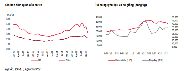Tuy nhiên, thị trường Trung Quốc là thị trường nhạy cảm về giá và giá bán trung bình đến thị trường này luôn thấp hơn khoảng 40% so với giá bán trung bình đến thị trường Mỹ. Nhìn chung, chúng tôi tin rằng doanh thu xuất khẩu Trung Quốc sẽ bù đắp một phần sự suy giảm doanh thu ở thị trường Hoa Kỳ và EU, nhưng không đủ để giúp các công ty phục hồi trong quý 4 năm 2022. Điều này có thể là do mức lợi nhuận cao vào năm 2022. Chúng tôi vẫn quan ngại về mức độ chắc chắn của các chính sách mở cửa trở lại của Trung Quốc. Hiện tại, chúng tôi dự báo KQKD năm 2023 của các công ty cá tra sẽ giảm đi.