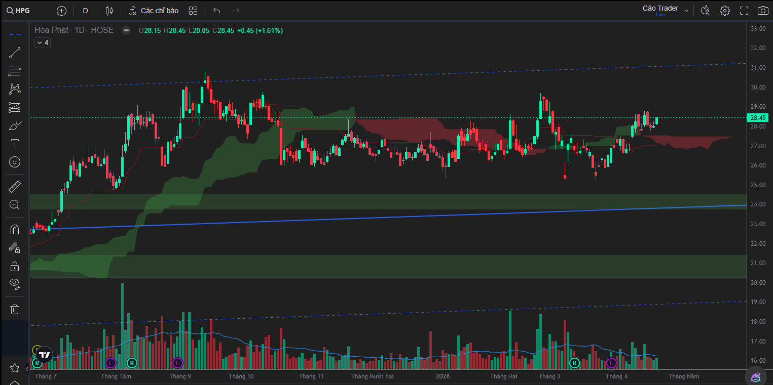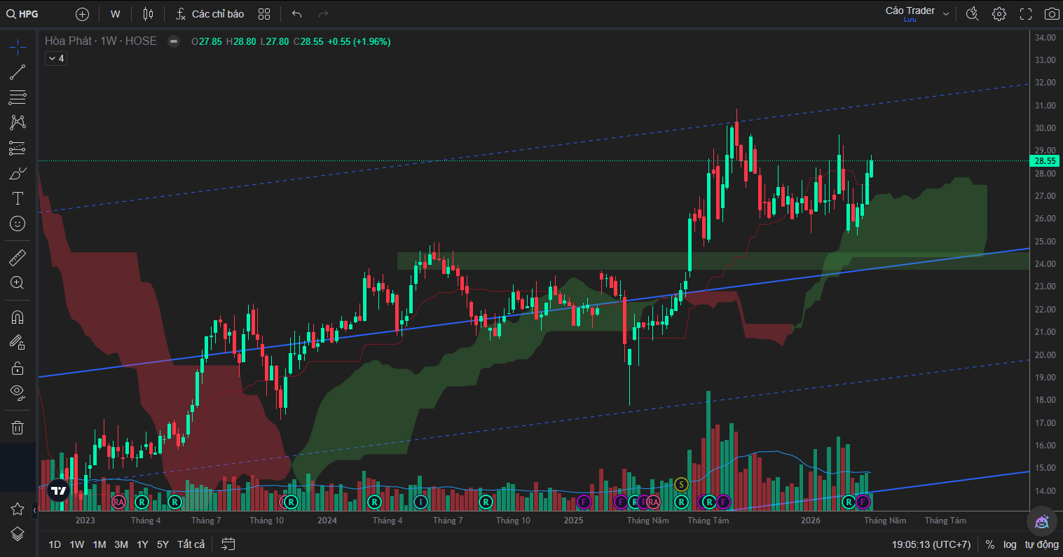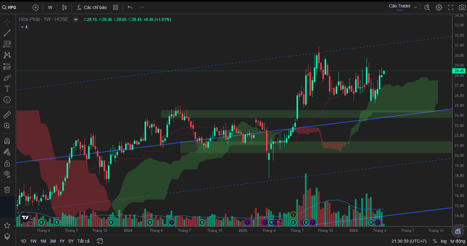 Trên khung tuần, HPG đang duy trì một cấu trúc tăng trung hạn tương đối ổn định kể từ vùng đáy chu kỳ 2022, thể hiện qua việc các đáy sau liên tục được nâng cao hơn các đáy trước. Đường trendline tăng dài hạn vẫn chưa bị phá vỡ, đóng vai trò là nền hỗ trợ quan trọng giúp duy trì xu hướng tổng thể. Tuy nhiên, điểm đáng chú ý là động lượng tăng không còn mạnh như giai đoạn đầu chu kỳ, mà đang dần chuyển sang trạng thái tích lũy và giằng co.