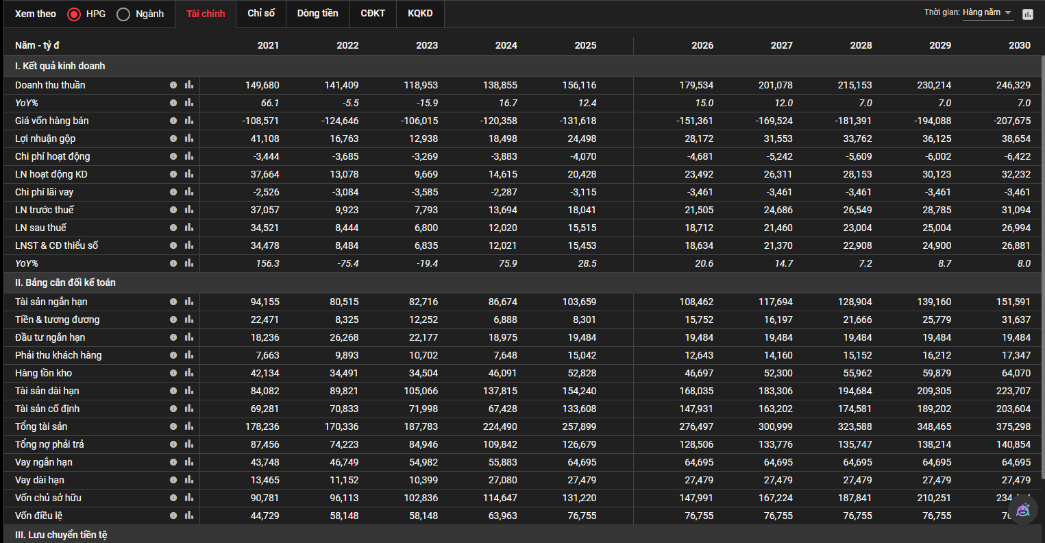 HPG là doanh nghiệp mang tính chu kỳ cao, vì vậy sự biến động trong kết quả kinh doanh phản ánh rất rõ trạng thái của ngành thép. Sau giai đoạn suy giảm mạnh 2022–2023, năm 2024–2025 đánh dấu sự phục hồi đáng kể cả về doanh thu lẫn lợi nhuận.