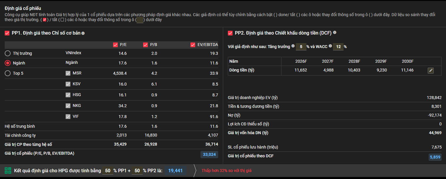 Theo mô hình định giá bạn cung cấp, giá trị hợp lý của HPG đang thấp hơn đáng kể so với giá thị trường hiện tại, cho thấy cổ phiếu đang được giao dịch với mức premium nhất định.