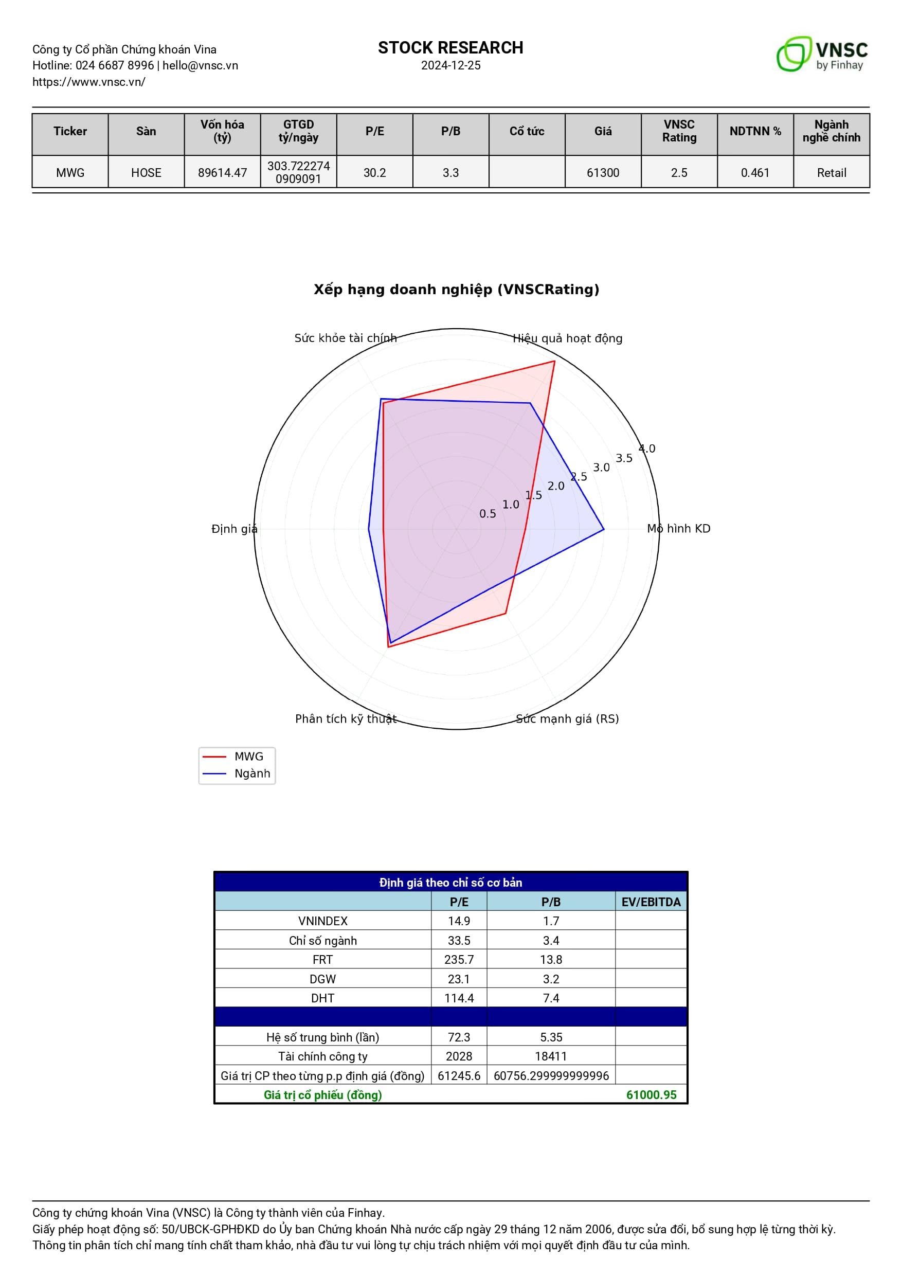 Phân tích tài chính của MWG cho thấy một số điểm nổi bật so với các công ty cùng ngành. Đầu tiên, doanh thu của MWG đạt 89,615 tỷ đồng, vượt xa so với mức 24,878 tỷ đồng của FRT và thấp hơn một chút so với DGW (9,074 tỷ đồng), điều này cho thấy MWG đang chiếm lợi thế vượt trội về quy mô và thị phần. Tuy nhiên, chỉ số biên lợi nhuận gộp của MWG chỉ đạt 15.7%, thấp hơn đáng kể so với FRT (41.6%) và SAS (16.2%), cho thấy áp lực cạnh tranh và chi phí sản xuất cao có thể ảnh hưởng đến khả năng sinh lời của MWG. Về chỉ số nợ, MWG có tỷ lệ nợ trên vốn chủ sở hữu là 0.202, cho thấy MWG duy trì cấu trúc tài chính lành mạnh hơn so với DGW (0.097) và SAS (0.637), điều này tạo ra sự ổn định tài chính tốt hơn trong bối cảnh áp lực từ lãi suất tăng cao. Bên cạnh đó, MWG cũng có chỉ số hoàn vốn trên vốn chủ sở hữu (ROE) đạt 20.576%, vượt xa so với FRT (-1.949%) và SAS (0.081%), cho thấy hiệu quả sử dụng vốn của MWG là tích cực hơn. Tuy nhiên, tình hình lợi nhuận ròng của MWG lại ghi nhận chỉ số -0.434, cho thấy một số khó khăn trong việc giữ vững lợi nhuận trong bối cảnh cạnh tranh quyết liệt. Tóm lại, MWG đang có thế mạnh về quy mô và hiệu quả sử dụng vốn, nhưng gặp khó khăn trong duy trì biên lợi nhuận gộp và lợi nhuận ròng.