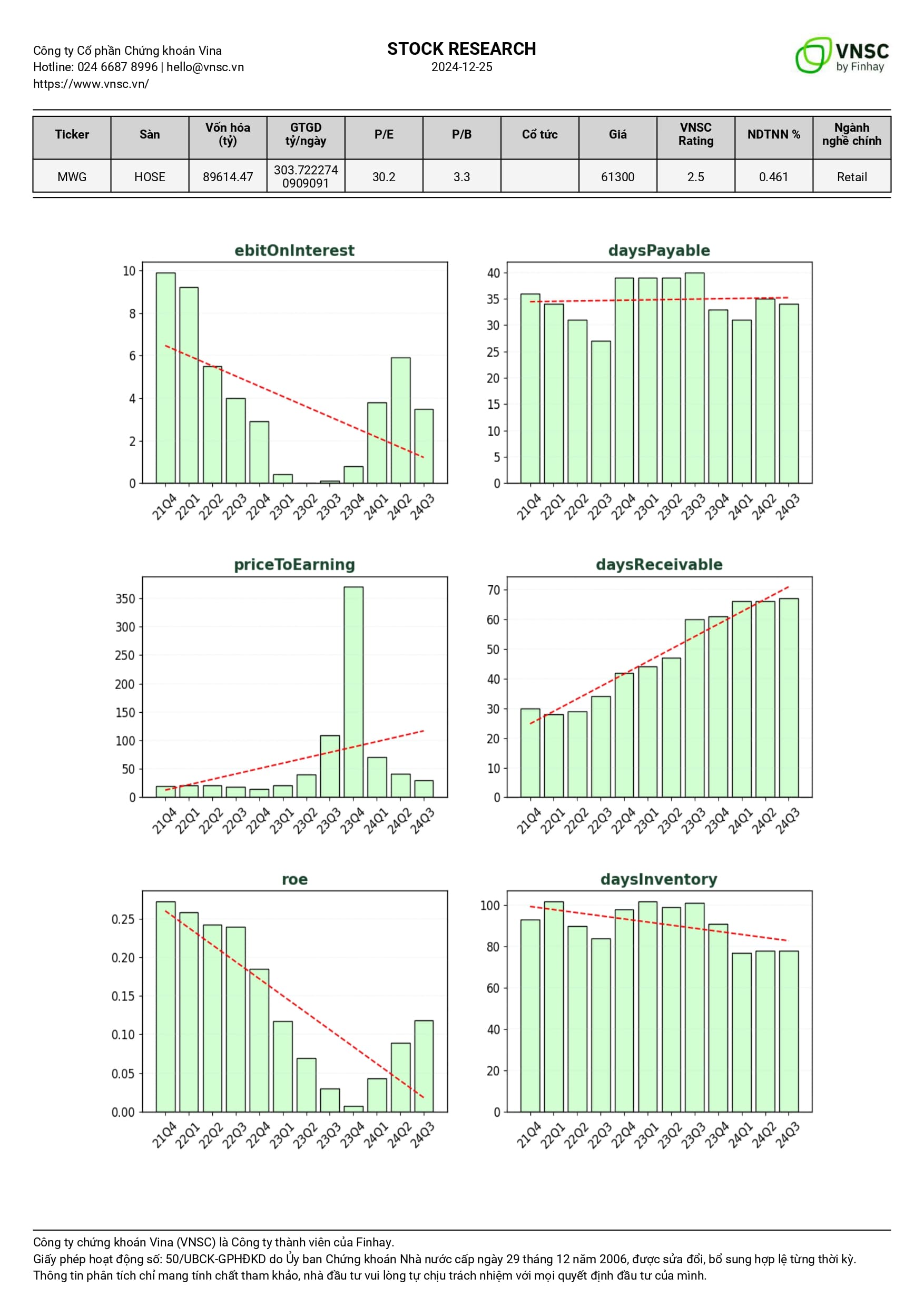 Từ dữ liệu tài chính của MWG trong ba quý gần đây, ta có thể thấy sự biến động mạnh mẽ trong kết quả kinh doanh và dòng tiền. Doanh thu trong quý 3 năm 2024 đạt 34,147 tỷ đồng, gần như giữ ổn định so với quý trước, nhưng lợi nhuận gộp lại có xu hướng giảm (-0.054 năm trước nay chuyển thành 0.127). Một điểm quan trọng là chỉ số nợ ngắn hạn và dài hạn hiện tại đều ghi nhận sự gia tăng, cho thấy MWG đã phải vay mượn nhiều hơn để duy trì hoạt động. Trong khi đó, dòng tiền từ hoạt động kinh doanh liên tục tăng trong các quý, đạt 61,075 tỷ đồng trong quý 3 năm 2024, cho thấy khả năng tạo tiền mặt có phần cải thiện bất chấp lợi nhuận thấp. Tuy nhiên, dòng tiền tự do lại suy giảm, từ 8,819 tỷ xuống còn 5,825 tỷ đồng cho thấy áp lực tài chính có thể gia tăng trong tương lai. Tổng hợp các yếu tố trên, nếu không có biện pháp cải thiện hiệu suất hoạt động và quản lý nợ hiệu quả hơn, MWG có nguy cơ sẽ gặp phải khó khăn về thanh khoản và lợi nhuận trong 1-3 năm tới, đặc biệt là trong bối cảnh thị trường cạnh tranh và chi phí gia tăng.