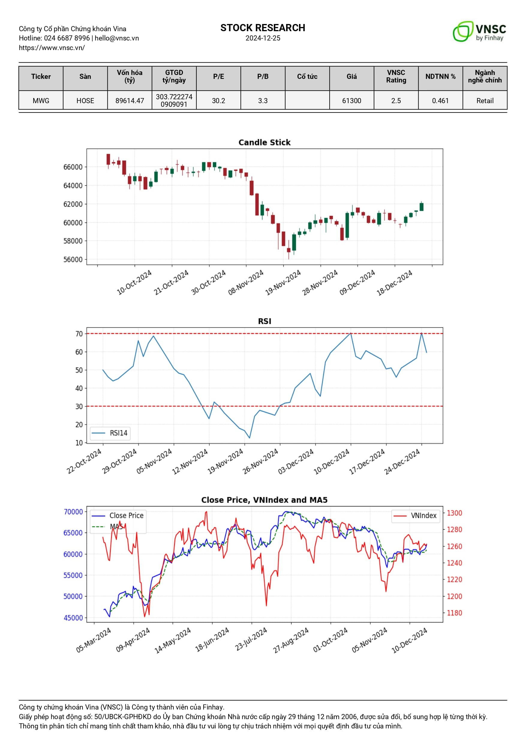 Trong bối cảnh gần đây của mã cổ phiếu MWG, giá đóng cửa ở mức 62100 vào ngày 2024-12-25, cho thấy một mức hồi phục nhẹ sau giai đoạn giảm mạnh trước đó. Đường MA20 và MA30 đang giữ xu hướng giảm, với MA20 hiện tại khoảng 60505, điều này cho thấy áp lực bán vẫn còn tồn tại. Volume giao dịch gần đây bị biến động mạnh với khoảng 1 triệu cổ phiếu trong ngày 2024-12-25, cho thấy sự tham gia của nhà đầu tư vẫn còn khá tích cực, mặc dù giá không tăng mạnh. Chỉ báo RSI đang ở mức 59.65, cho thấy tính chất tích cực nhưng chưa đạt đến mức quá mua, cho thấy còn có không gian cho việc tăng trưởng. MACD đã chuyển sang trạng thái cân bằng hơn khi Histogram có giá trị 297.92, cho thấy sự suy yếu của áp lực bán nhưng vẫn cần theo dõi chặt chẽ để tránh việc đảo chiều. Tuy nhiên, mức hỗ trợ mạnh được xác định ở 56800 và ngưỡng kháng cự tại 66500 vẫn còn nguyên vẹn. Với sự hiện diện của các yếu tố kỹ thuật này, MWG đang trong giai đoạn tìm kiếm sự ổn định trước khi quyết định xu hướng tiếp theo.