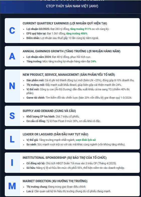 Dựa trên bộ lọc CANSLIM huyền thoại, ANV (Thủy sản Nam Việt) đang nổi lên là cổ phiếu dẫn dắt (Leader) hiếm hoi trong giai đoạn hiện tại với các tiêu chí đạt chuẩn “Vàng”: