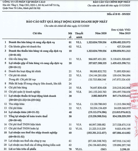 Tiếp tục năm 2020, Doanh thu đạt 1300 tỷ biên lãi tầm 30% được 350 tỷ, Chi phí lãi vay (130 tỷ) , quản lý doanh nghiệp (240 tỷ) , chi phí bán hàng (80 tỷ ), cả năm chỉ lỗ -100 tỷ