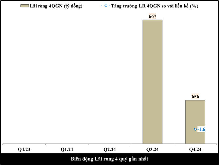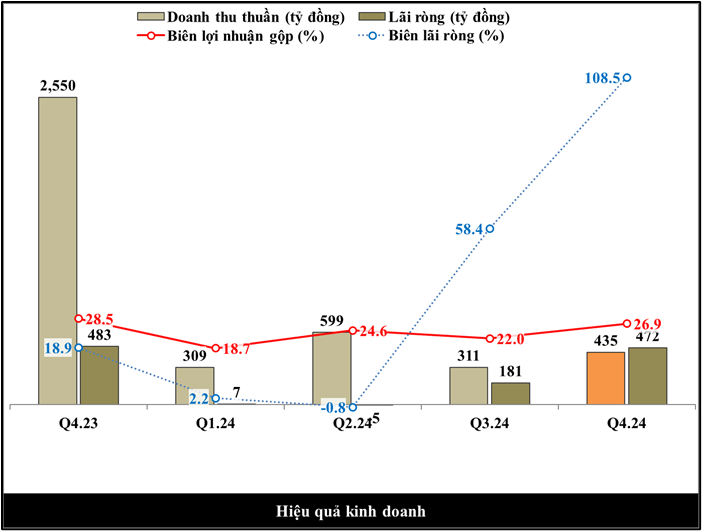 Biên lãi ròng cả công ty đạt 108.5% cho biết cứ 100 đồng DTT bán ra trong Q4.24 thì doanh nghiệp tạo ra được 108.5 đồng lãi ròng.