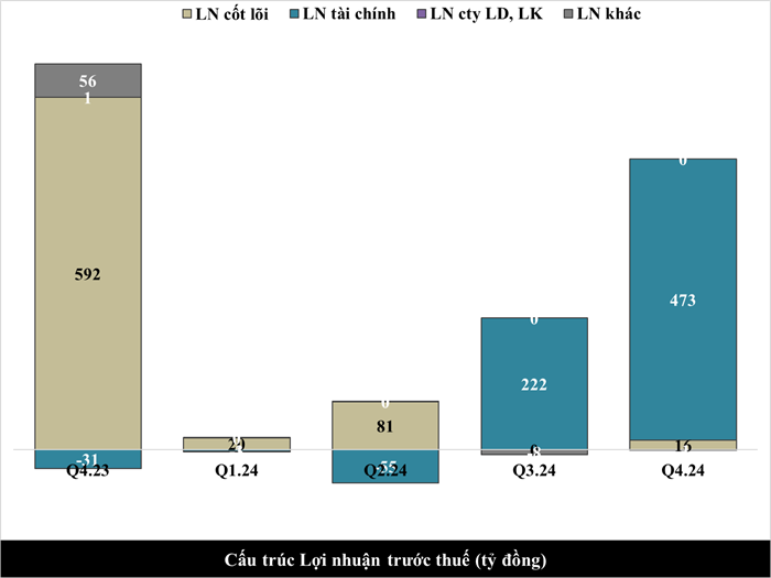 Lãi ròng Q4.24 cao hơn doanh thu nhờ sự đóng góp lớn từ lợi nhuận tài chính tăng mạnh (Biểu đồ số 2). Công ty đã chuyển nhượng cổ phần của doanh nghiệp sở hữu dự án thành phần Lô B3-CC2A Starlake (khối văn phòng), cụ thể là CTCP Tầm nhìn Hồ Tây.