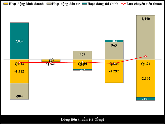 Dòng tiền thuần từ hoạt động đầu tư cả năm 2024 dương do trong kỳ doanh nghiệp thoái vốn Công ty TAH và Công ty tầm nhìn Hồ Tây như đã đề cập ở trên.