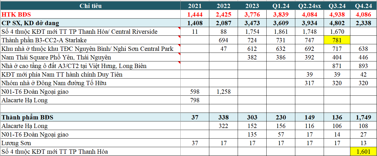 DTT Q4.23 tăng đột biến nhờ bàn giao nhiều dự án, bao gồm: Dự án Tòa nhà hỗn hợp cao tầng NO1T6, Khu Đoàn Ngoại giao (Hà Nội); Dự án Alacarte Hạ Long; và một phần dự án Khu đô thị số 4, TP Thanh Hóa (mở bán đợt 1 từ tháng 12/2023) (theo giải trình KQKD Q4.23).