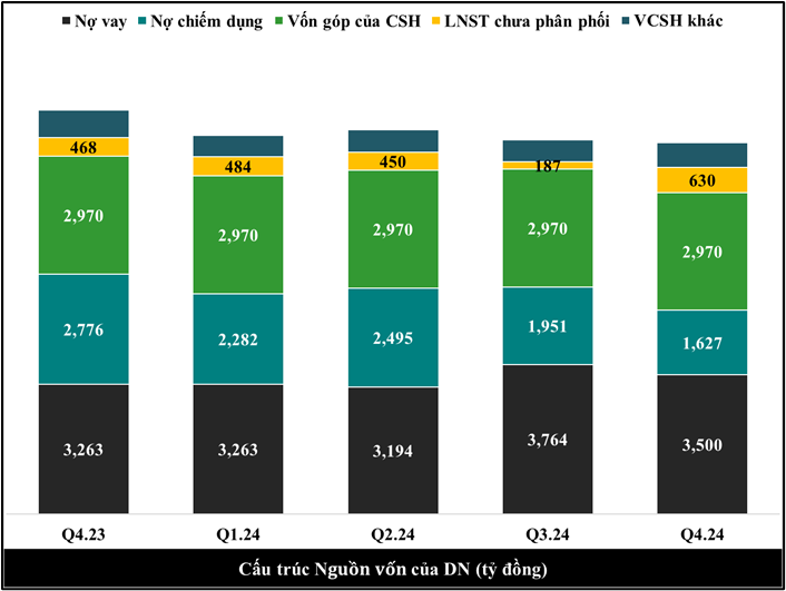 Xu hướng người mua trả tiền trước có sự gia tăng từ 75 tỷ trong Q3.24 đồng lên 133 tỷ đồng trong Q4.24 có thể do việc mở bán dự án số 4 Thanh Hóa - Central Riverside khi khoản mục Chi phí sản xuất, kinh doanh dở dang của dự án này đã kết chuyển sang thành phẩm BĐS trong Q4.2024.