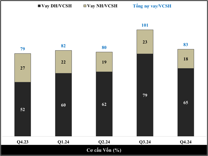 Tổng nợ vay/VCSH là 83% cho biết cứ 100 đồng VCSH thì doanh nghiệp có tương ứng 83 đồng nợ vay. Trong đó nợ vay dài hạn là 65 đồng và nợ vay ngắn hạn là 18 đồng. Nợ vay dài hạn được đảm bảo bằng các tài sản là dự án bất động sản.