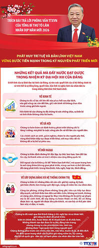 “Tôi mong mỗi gia đình đón năm mới bình an; mỗi người bước vào năm mới với một điều giản dị: làm tốt hơn công việc của mình, đời sống vật chất và tinh thần tốt lên từng ngày. Khi hàng triệu điều “tốt hơn” ấy cộng lại, đất nước sẽ mạnh lên một cách bền vững” - Tổng Bí thư Tô Lâm