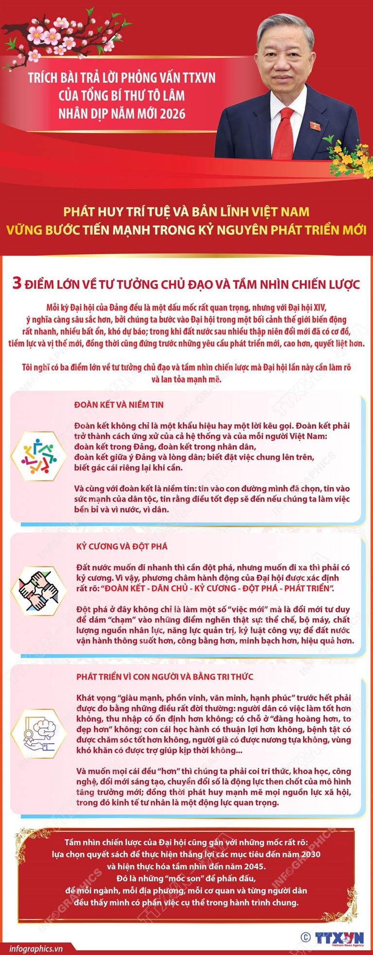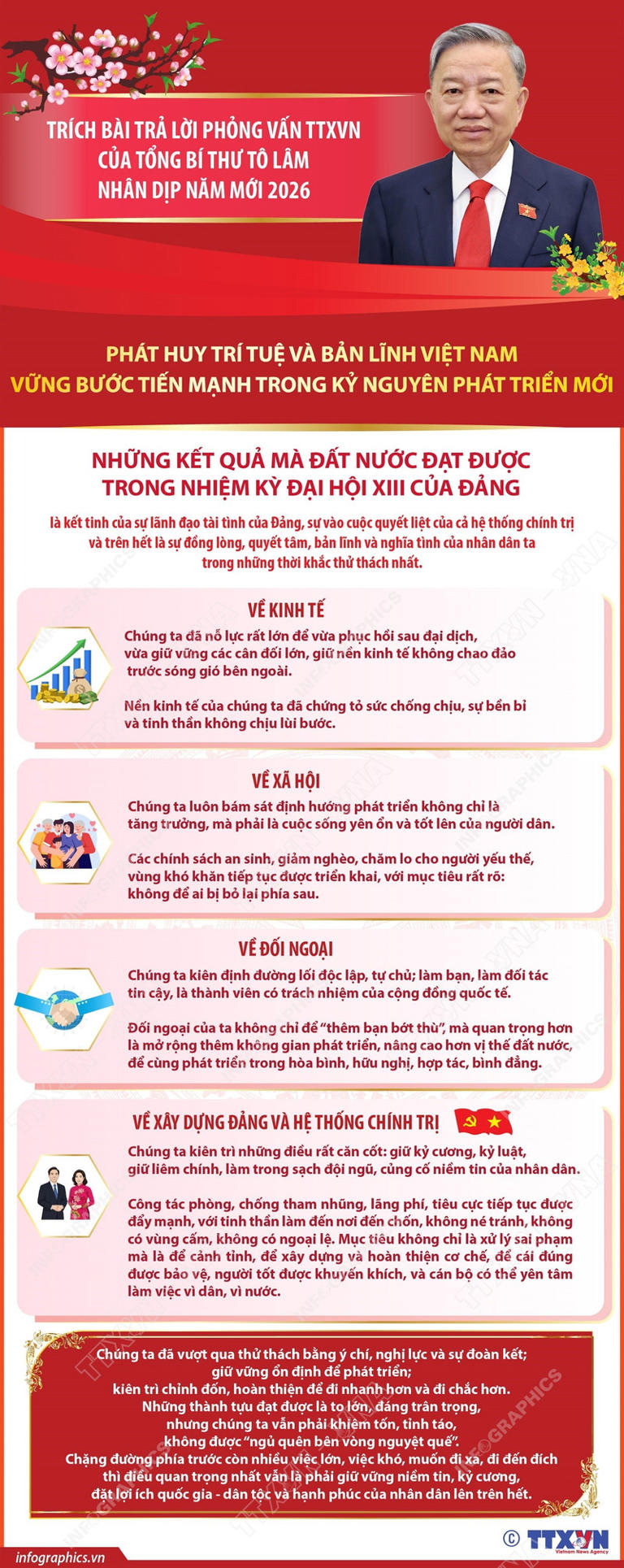 Trong bài trả lời phỏng vấn TTXVN Tết 2026, Tổng Bí thư Tô Lâm khẳng định những kết quả mà đất nước đạt được trong nhiệm kỳ vừa qua là kết tinh của sự lãnh đạo tài tình của Đảng, sự vào cuộc quyết liệt của cả hệ thống chính trị và trên hết là sự đồng lòng, quyết tâm, bản lĩnh và nghĩa tình của nhân dân ta trong những thời khắc thử thách nhất.