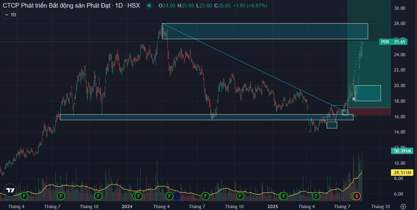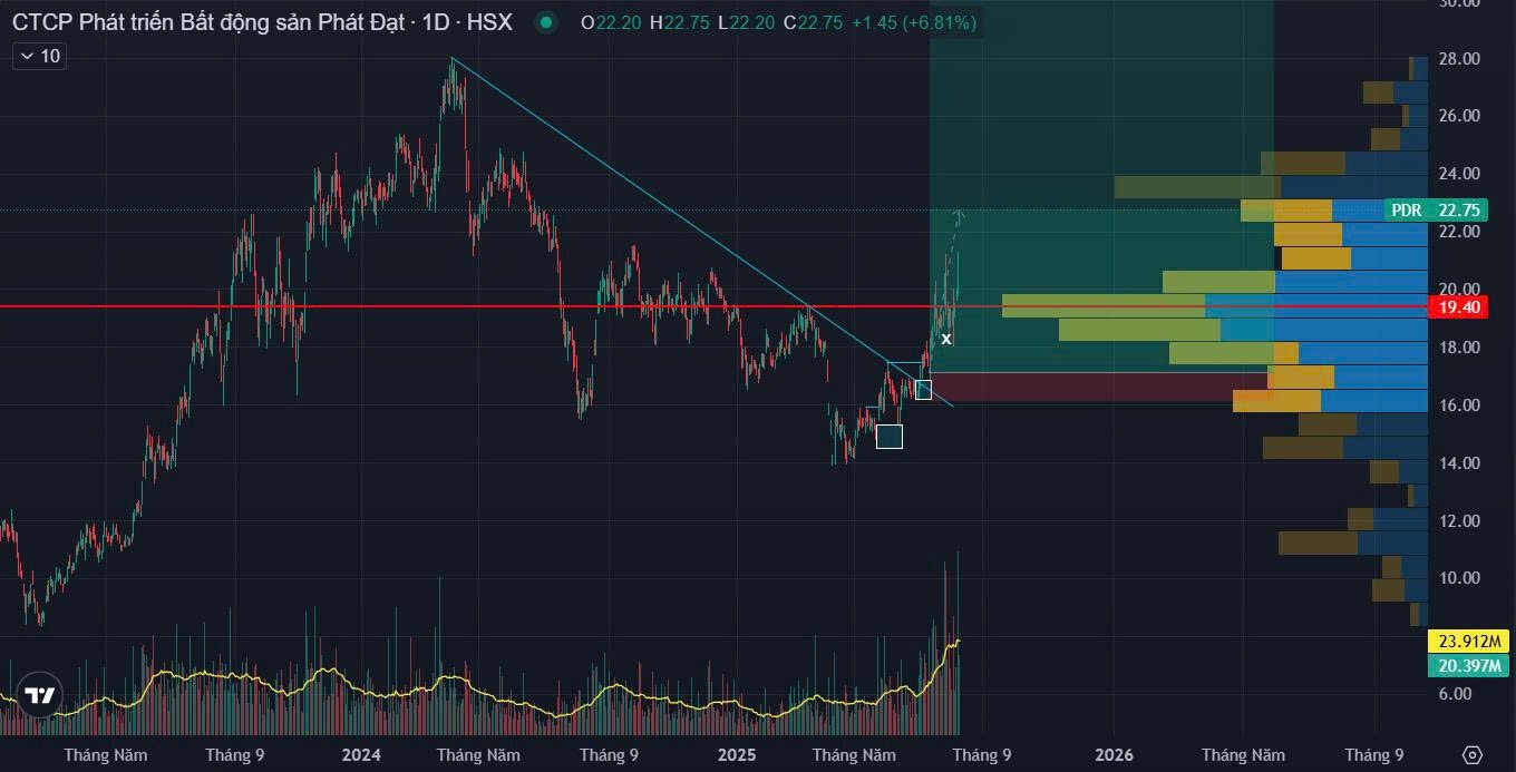 PDR vượt vùng trading range nơi tập trung nhiều khối lượng giao dịch nhất của cổ phiếu, mốc target ngắn tiếp theo ở quanh 23+