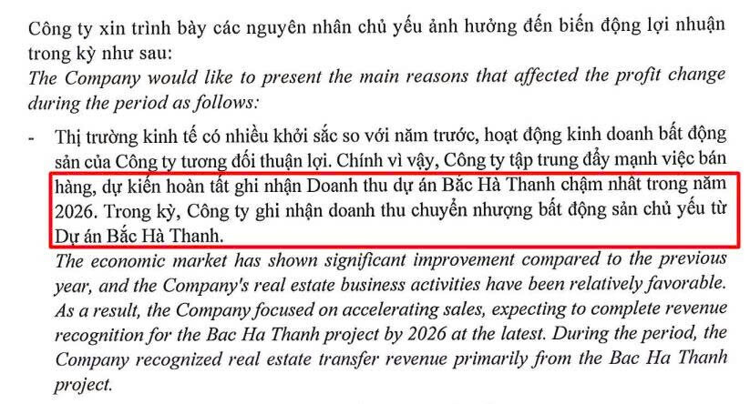 Trong giải trình kết quả kinh doanh 6 tháng của PDR vừa rồi, doanh nghiệp có đề cập đến dự án Bắc Hà Thanh dự kiến sẽ hoàn tất ghi nhận doanh thu chậm nhất trong năm 2026 → Bắc Hà Thanh sẽ là nguồn thu nhập chính của PDR trong giai đoạn 2025 - 2026.