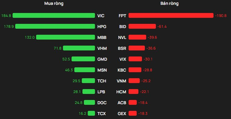 Ở chiều ngược lại, FPT bị bán ròng mạnh nhất với giá trị khoảng 191 tỷ đồng. Theo sau là BID với gần 61 tỷ đồng, NVL với khoảng 40 tỷ đồng, BSR với gần 37 tỷ đồng và VIX với khoảng 30 tỷ đồng.