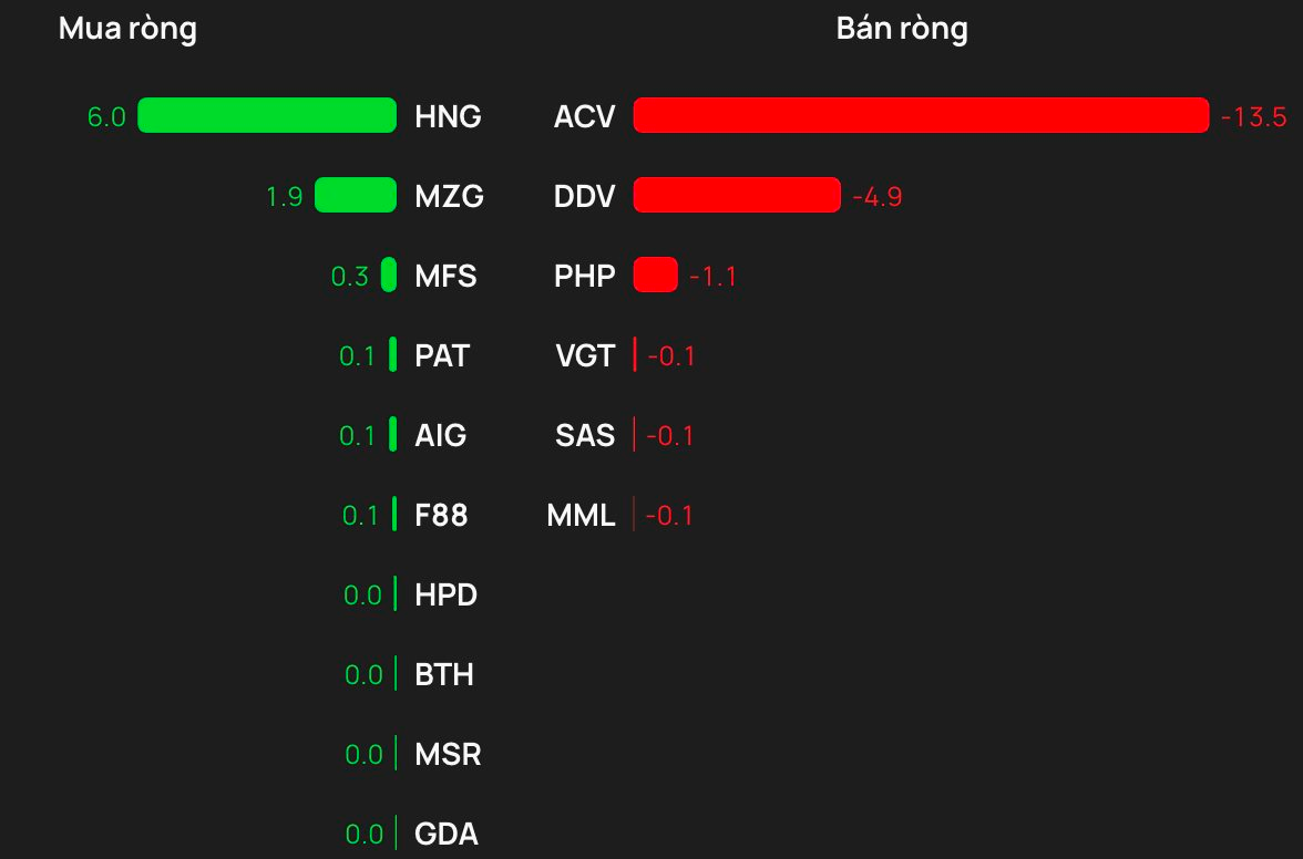 Ở chiều mua, HNG là mã được gom ròng mạnh nhất khoảng 6 tỷ. MZG cũng được mua ròng 2 tỷ đồng. Các mã khác như MFS, PAT, AIG cũng được mua ròng nhẹ.