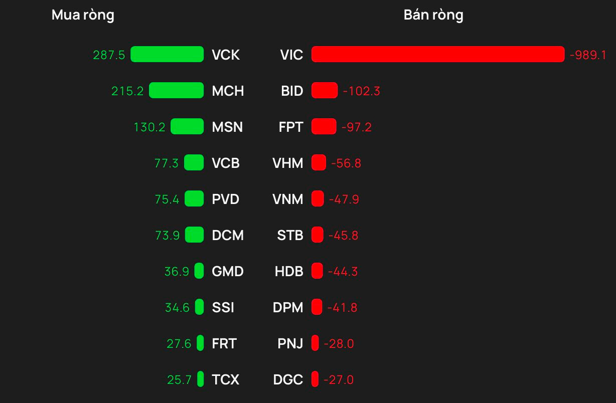 Ở chiều ngược lại, áp lực bán ròng tập trung mạnh nhất tại VIC với giá trị đột biến 989 tỷ đồng, bỏ xa các mã còn lại. Theo sau danh sách bán ròng là BID (-102 tỷ đồng), FPT (-97 tỷ đồng), VHM (-57 tỷ đồng), VNM (-48 tỷ đồng). Một số cổ phiếu khác như STB, HDB, DPM,… cũng nằm trong danh sách bị bán ròng mạnh.