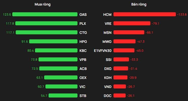 Ở chiều mua, dòng tiền ngoại ghi nhận lực “gom” mạnh tại nhóm cổ phiếu dầu khí. GAS là mã được mua ròng mạnh nhất với giá trị khoảng 124 tỷ đồng, theo sau là PLX (118 tỷ đồng). CTG cũng được mua ròng trên trăm tỷ đồng. Vị trí tiếp theo trong top 5 mua ròng lần lượt là HPG (92 tỷ đồng) và KBC (80 tỷ đồng).