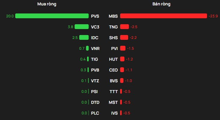 Ở chiều mua, PVS dẫn đầu danh sách được mua ròng với quy mô khoảng 20 tỷ đồng, bỏ xa phần còn lại. Theo sau là VC3 (4 tỷ đồng) và IDC (3 tỷ đồng). Hai mã còn lại trong top 5 mua ròng là VNR (1 tỷ đồng) và TIG.
