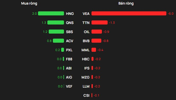 Ở chiều ngược lại, lực “gom” tập trung ở một vài mã vốn hóa vừa và nhỏ, trong đó HNG được mua ròng mạnh nhất khoảng 2 tỷ đồng. Các vị trí tiếp theo lần lượt thuộc về QNS (1 tỷ đồng), SBS (1 tỷ đồng), ACV (1 tỷ đồng) và PXL.