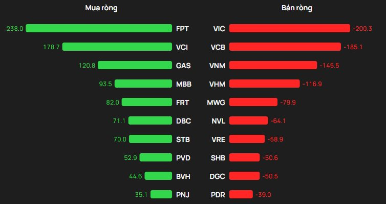 Ở chiều ngược lại, áp lực bán ròng tập trung vào các bluechips khi VIC bị xả mạnh nhất (xấp xỉ 200 tỷ đồng), kế đến là VCB (gần 185 tỷ), VNM (khoảng 146 tỷ), VHM (xấp xỉ 117 tỷ) và MWG (khoảng 80 tỷ).
