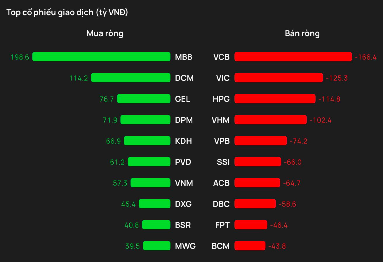 Ngược lại, VCB là cổ phiếu khối ngoại bán mạnh nhất với 166 tỷ đồng. Theo sau, các cổ phiếu VIC và HPG cũng bị “xả” 125 tỷ đồng và 115 tỷ đồng.