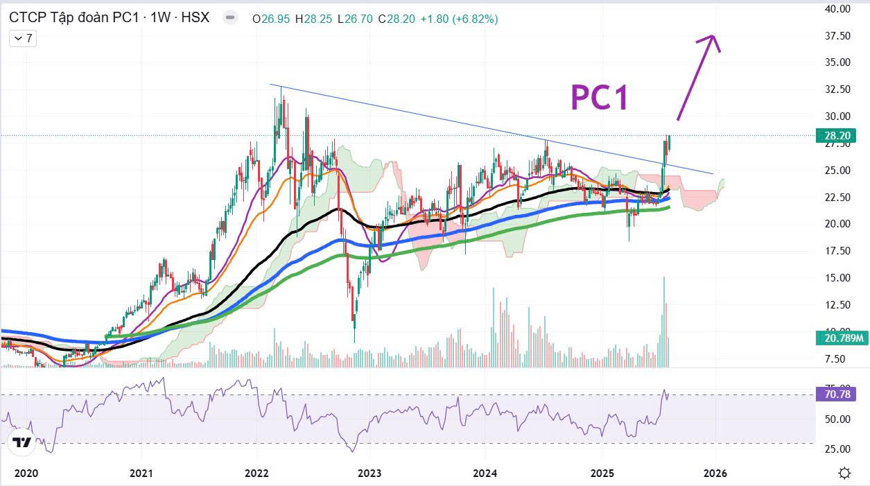 Hôm nay PC1 chính thức xác nhận phá vỡ đường trend giảm dài hạn, tiền vào rất tốt, giá đóng cửa 28.2 – tăng gần 4.44%, mở ra con sóng tăng trung – dài hạn đầy tiềm năng.