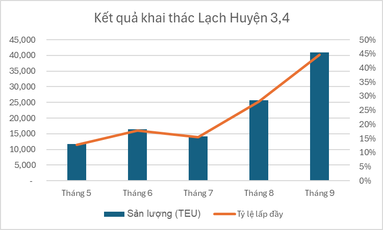 Chiều ngày 16/4, Lạch huyện 3,4 đón chuyến tàu thương mai đầu tiên. Từ đó đến nay HTIT (lạch huyện 3,4) đã có sự tăng trưởng thần tốc cùng tỷ lệ lấp đầy vượt ngoài mong đợi. Chỉ sau hơn 5 tháng hoạt động, HTIT đã ghi nhận sản lượng ấn tương: 40,953 TEU tương đương 45% công suất thiết kế (1,1 triệu TEU/Năm). Người anh em Lạch Huyện 1,2 phải mất hơn 2 năm để đạt mức sản lượng này trong khi HTIT chỉ cần 2 quý.