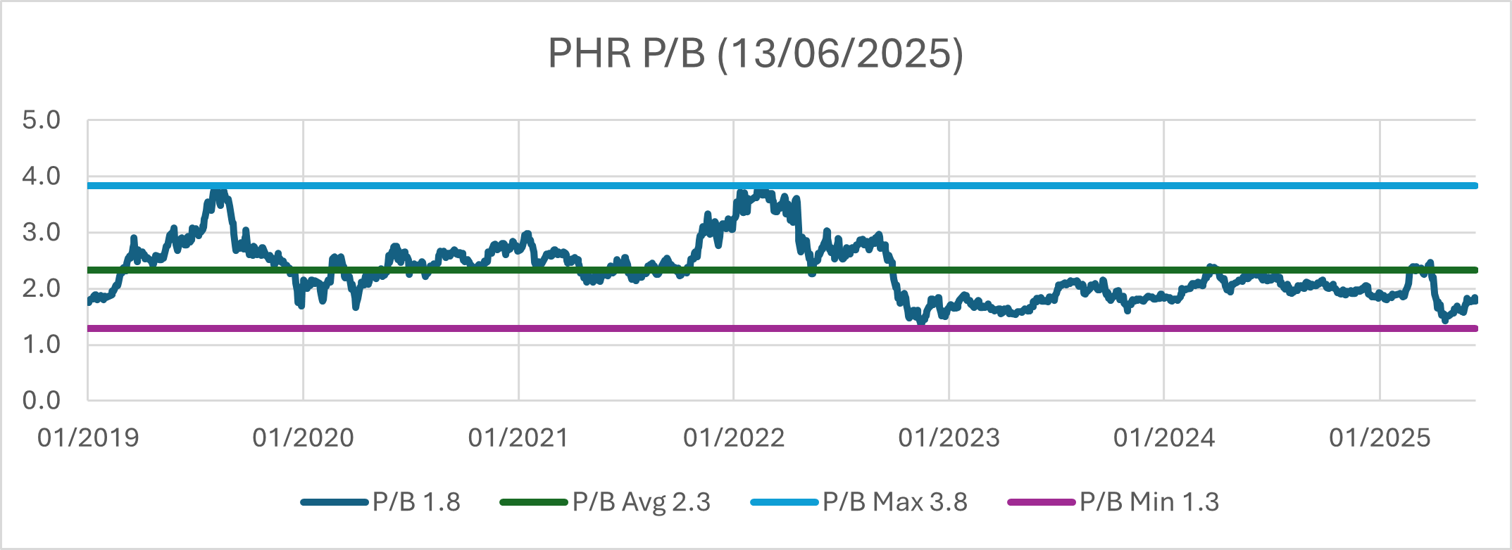 P/B hiện tại 1.8, P/B trung bình từ 2019 2.3, P/B tối đa 3.8 và P/B tối thiếu 1.3.