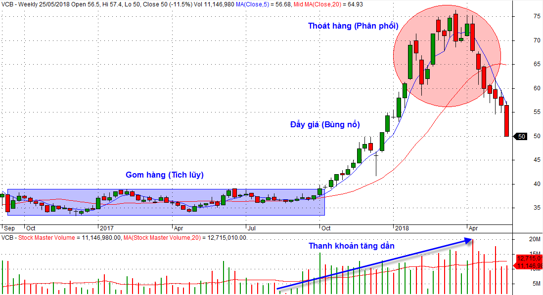 Khi đạt vùng giá mục tiêu, dòng tiền thông minh sẽ bắt đầu bán ra. Lúc này thanh khoản đã ở mức cao kết hợp cùng một vài tin tốt được bơm ra công chúng giúp việc thoát hàng trở nên thuận lợi.