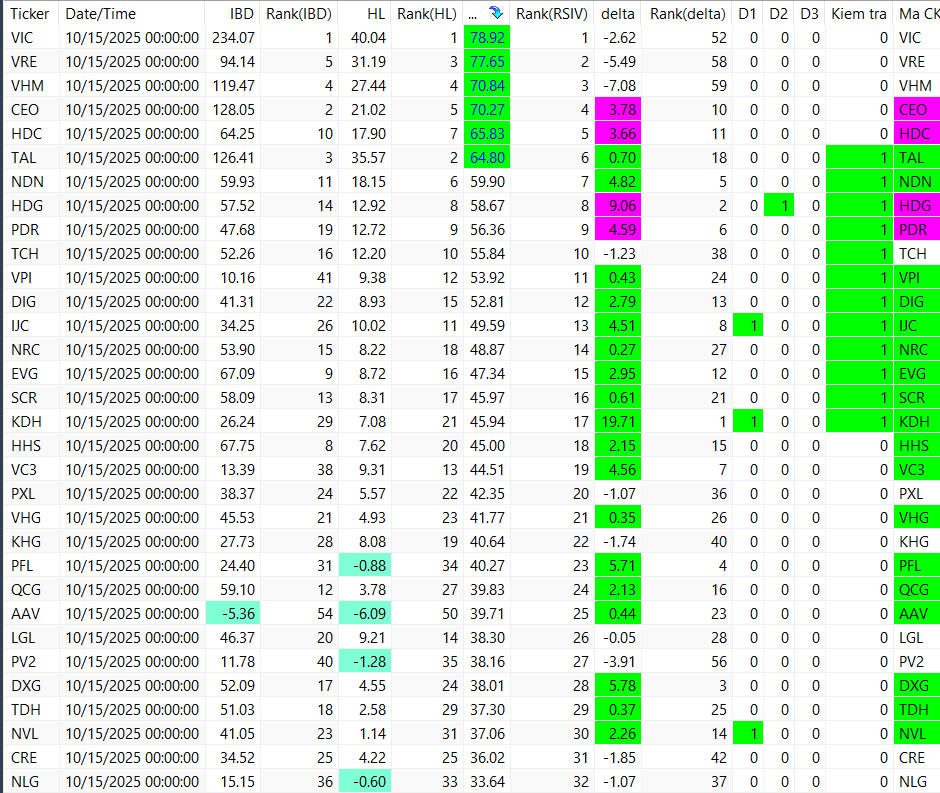 Trong bảng dạng này chỉ nên quan tâm cp có RSIV >45 trở lên. Khi có điểm thì xác suất tăng tốt hơn nhóm ở dưới. Nhìn vào cột kiểm tra là có số 1. Tức là nhóm đấy mới khá hơn index . còn loại ở trên cùng là mạnh hơn hẳn index và qua điểm mua đẹp