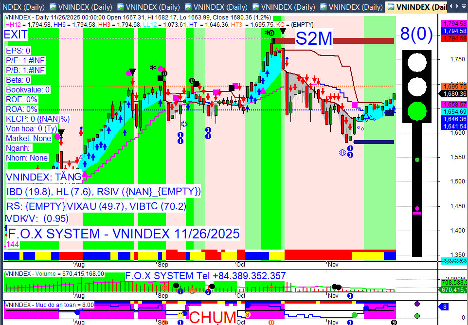 VN-Index phiên 25/11/2025: Đóng cửa ở mức 1.660,36 điểm, giảm 7,62 điểm (-0,46%).