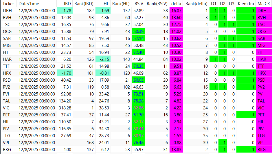 Điều chỉnh/Phân hóa: Nhiều bluechip và nhóm ngân hàng như SHB, TCB, STB, MBB giảm 2-3% trong phiên 05/12. Các nhóm có tính thị trường cao như Chứng khoán, Bất động sản và MIDCAP gặp khó khăn do thanh khoản thấp và dòng tiền mới teo tóp.