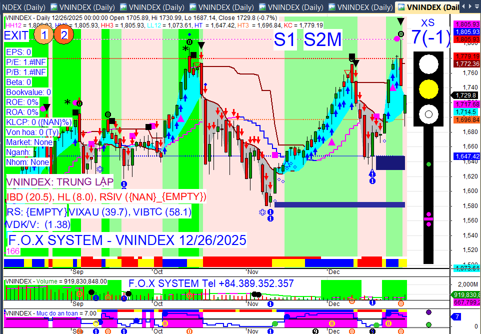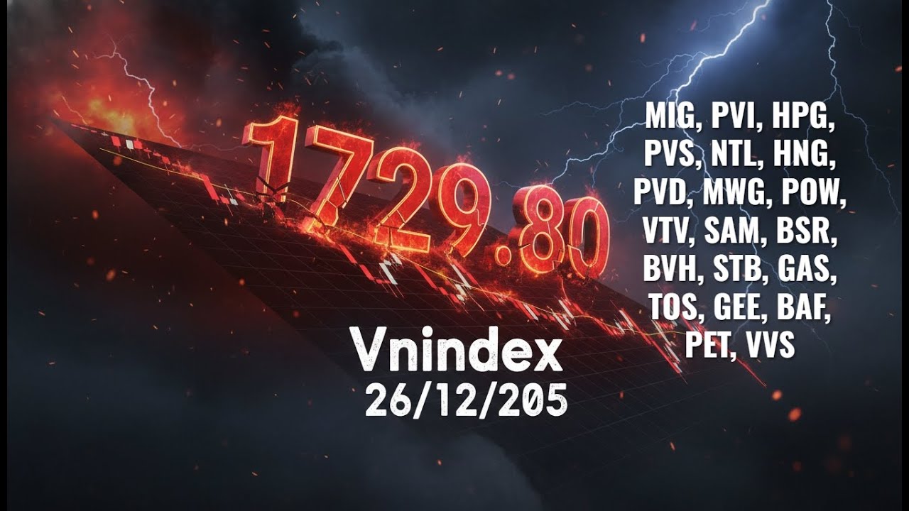 VN-Index phiên cuối tuần (26/12/2025): Đóng cửa giảm 13,05 điểm (-0,75%) xuống 1.729,8 điểm, nhưng đã hồi phục mạnh 43 điểm từ đáy phiên.