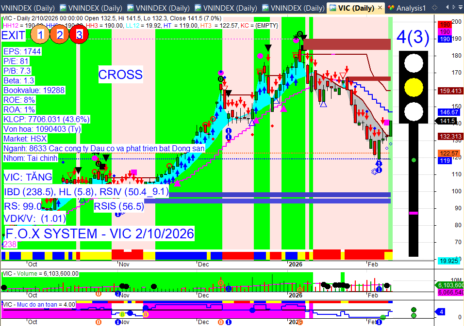 VIC sau khi có tam giác rỗng màu xanh , kèm theo số 1 là 2 dấu hiệu nhận diện sóng. Tiếp theo đã xuất hiện vùng trũng trước đó và có chấm vuông tím dò đáy