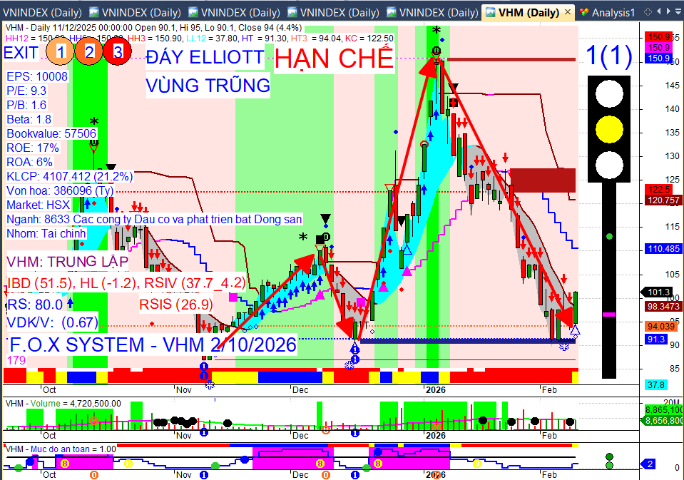 VHM đã có tam giác rỗng màu xanh nhận diện sóng. Đã xuất hiện vùng trũng. Khi có vùng trũng là đảo chiều suy nghĩ sang tập trung chiều mua khi có các tín hiệu rõ hơn. Có thể dò một chút rồi dần dần các tín hiệu rõ hơn thì vào thêm.