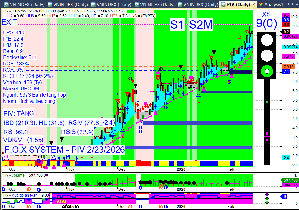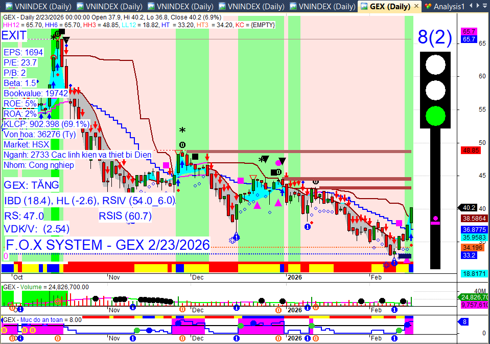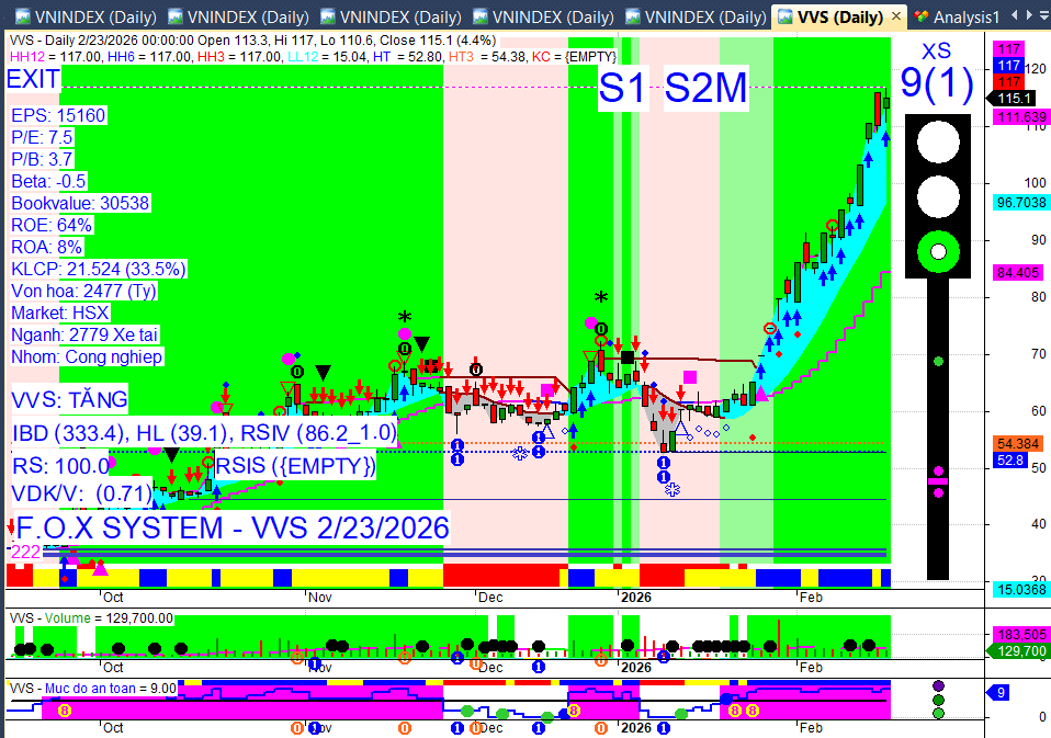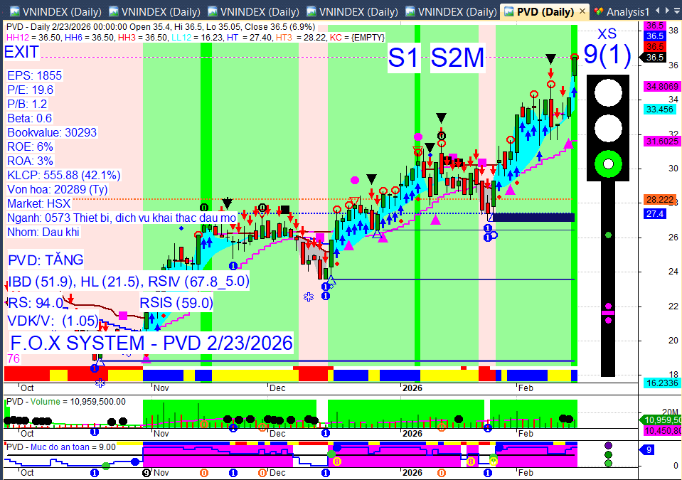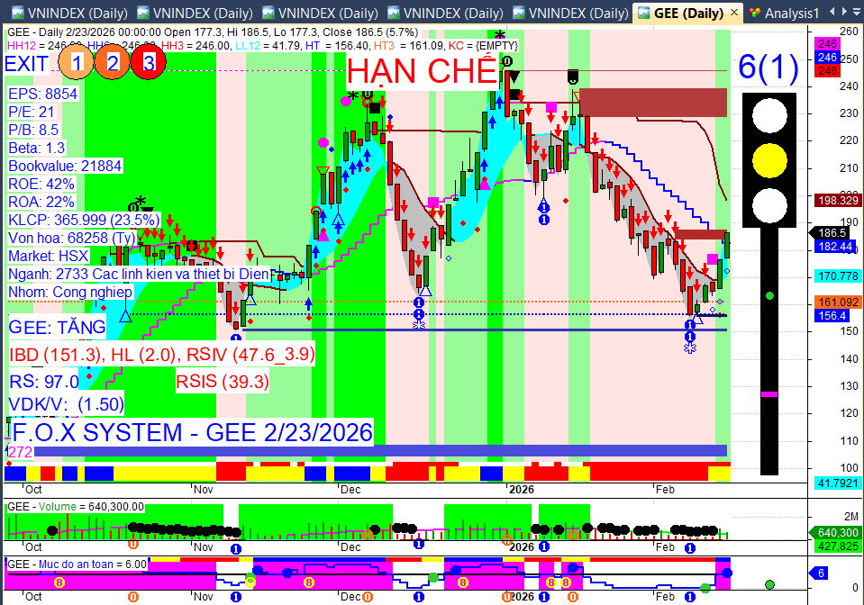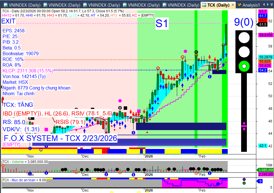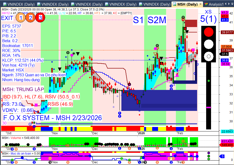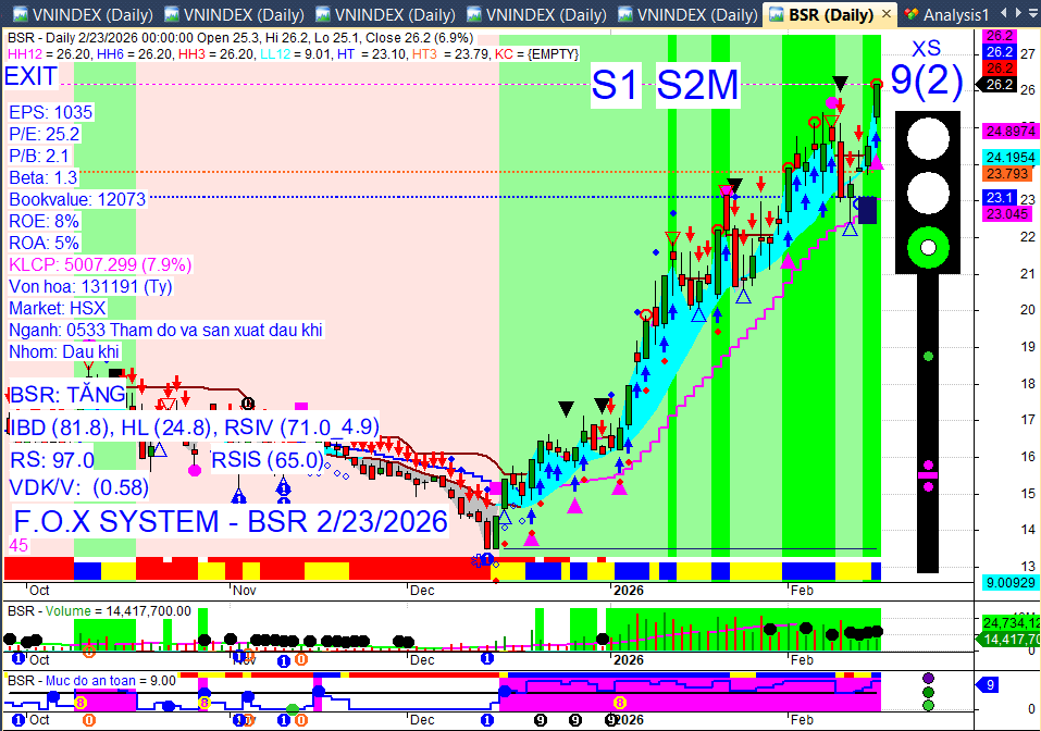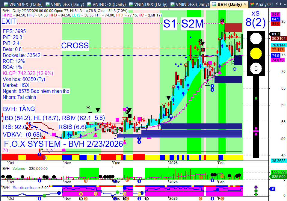 Nhận định xu hướng: Thị trường có thể tiếp tục quán tính tăng trong phiên 24/02/2026 để kiểm định vùng kháng cự 1.880 - 1.900 điểm, hoặc mở rộng đà tăng lên 1.920 điểm nếu vượt thành công. Tuy nhiên, đà tăng đang khá dốc và thiếu sự đồng thuận của thị trường chung.