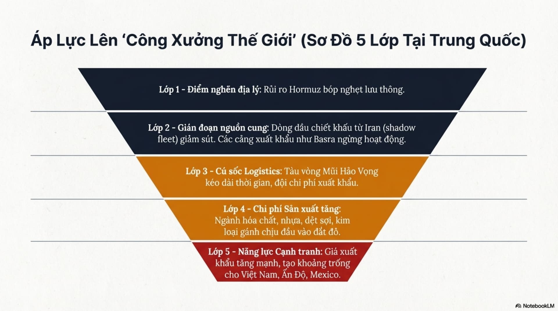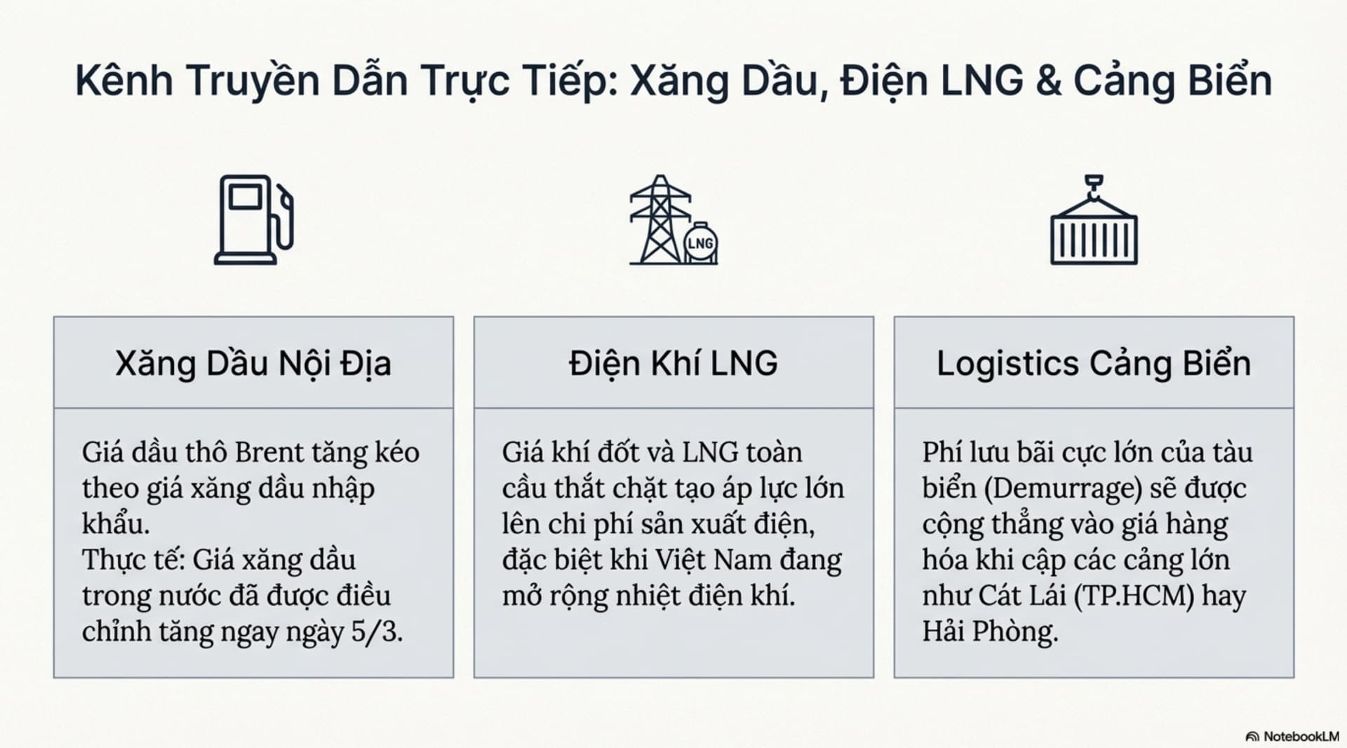 Tác động đến chuỗi cung ứng toàn cầu: Căng thẳng tại Trung Đông gây ra cú sốc lớn đối với hoạt động vận tải, giao thương quốc tế và chuỗi cung ứng toàn cầu. Rủi ro gián đoạn chuỗi cung ứng năng lượng toàn cầu đặc biệt cao tại Eo biển Hormuz, tuyến hàng hải chiến lược vận chuyển khoảng 20% nguồn cung dầu thế giới.