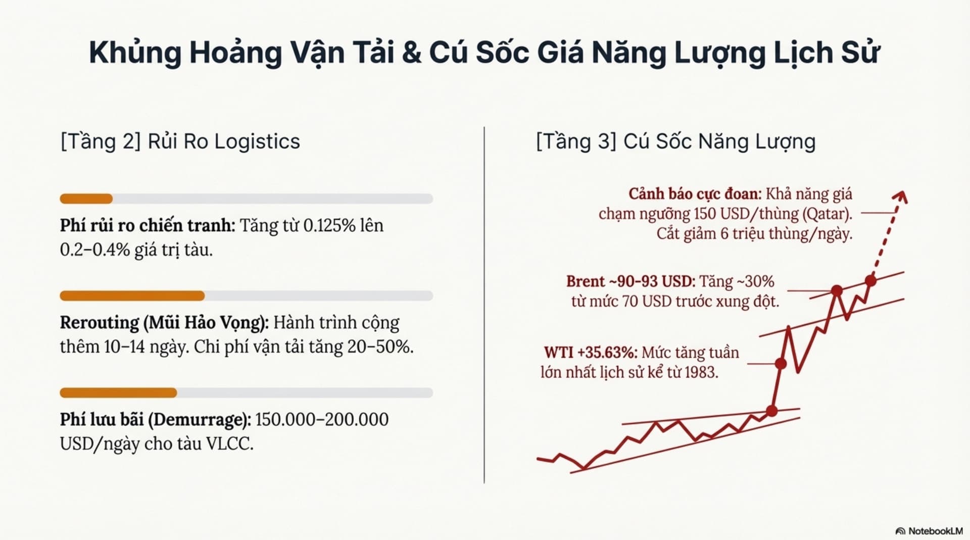 Chi phí vận tải: Nhiều doanh nghiệp Việt Nam xuất khẩu sang Trung Đông đối mặt với thách thức về chi phí vận tải tăng (cước tàu biển có thể tăng 20-30%, phụ phí bảo hiểm chiến tranh tăng), do tàu phải chuyển hướng qua Mũi Hảo Vọng, kéo dài hải trình 8-15 ngày.