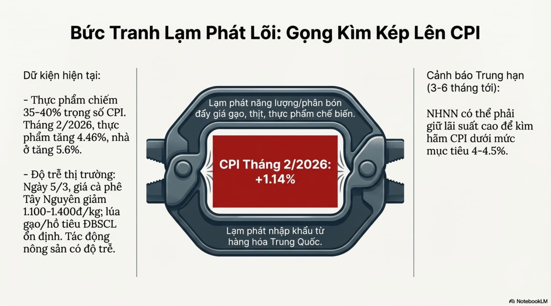 Lạm phát: Chỉ số giá tiêu dùng (CPI) tháng 02/2026 tăng do chi phí nhà ở, điện, nước, chất đốt, vật liệu xây dựng, nhu cầu mua sắm dịp Tết Nguyên đán và giá vàng trong nước tăng. Giá xăng dầu cũng đồng loạt tăng từ ngày 05/03/2026.