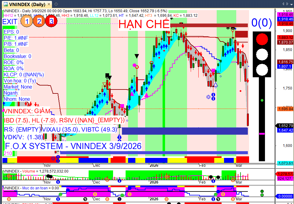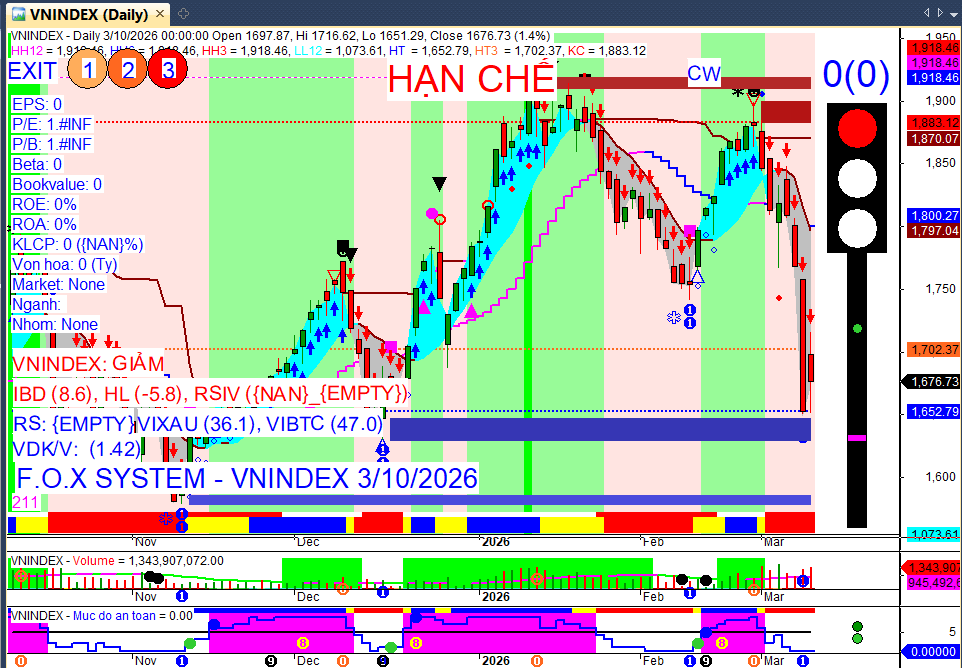Nhận định xu hướng: Thị trường có thể tiếp tục chịu áp lực giảm điểm trong đầu phiên 10/03, kiểm định các vùng hỗ trợ quanh 1.630-1.600 điểm. Tuy nhiên, khả năng xuất hiện nhịp hồi kỹ thuật là cao khi nhiều cổ phiếu đã rơi vào vùng quá bán và giá dầu hạ nhiệt.