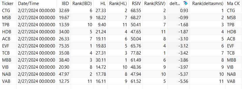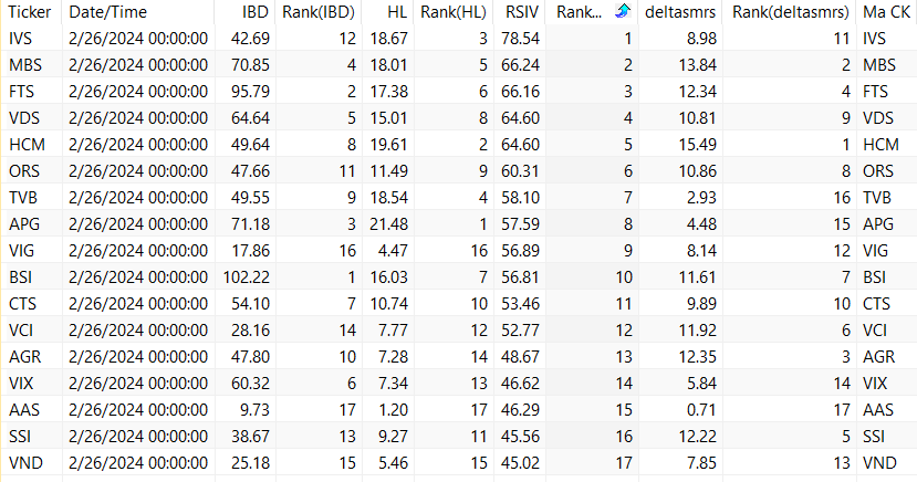 còn cột Rank(deltasmrs) cho ta biết cp tích cực trong phiên ta xét. Ví dụ ngày 26/2/2024 thì HCM đứng số 1, MBS số 2 và AGR số 3, FTS số 4