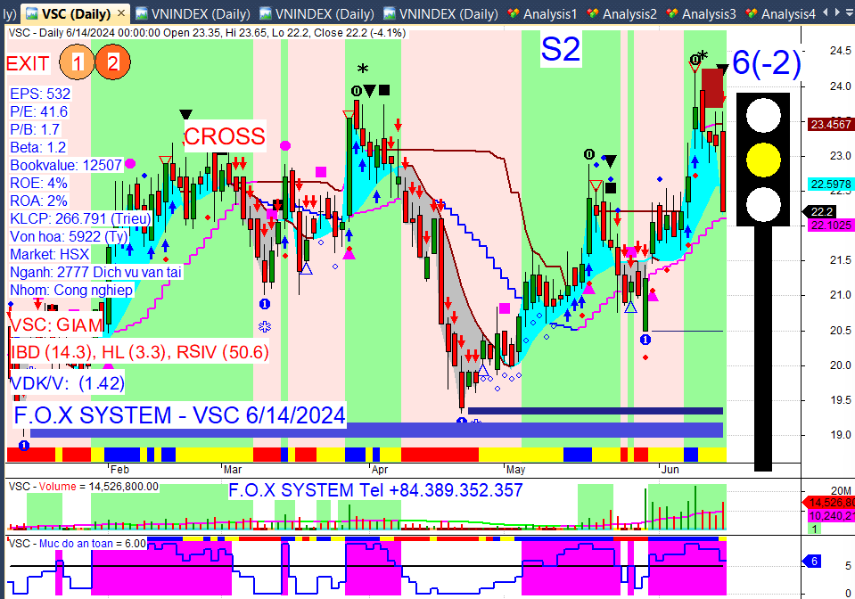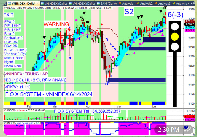 Cuối phiên Vnindex đã xuất hiện thêm cảnh báo, chấm vuông đen, tam giác đen.Đã xuất hiện mũi tên đỏ đầu tiên trong vùng hồng, Mức an toàn 3 xuống dưới 5. Chữ Vnindex giảm